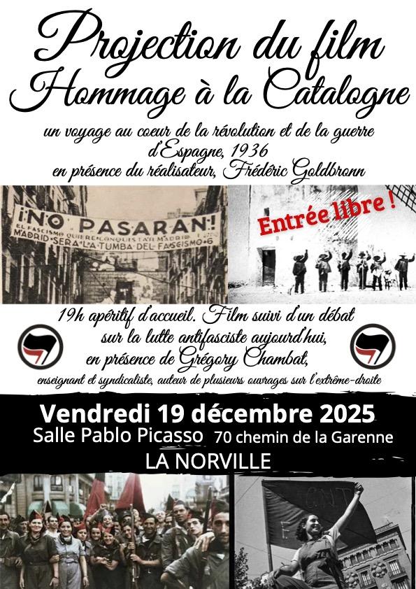 En présence du réalisateur d’Hommage à la Catalogne, Frédéric Goldbronn, la projection sera suivie d’un débat sur la lutte antifasciste aujourd’hui avec Grégory Chambat, enseignant et syndicaliste auteur de plusieurs ouvrages sur l’extrême droite, notamment « Quand l’extrême-droite rêve de faire école ».